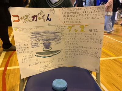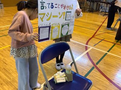 今回は学習のまとめとして「しあわせグッズ」の発表会を体育館で行いました。保護者の参観日に合わせましたので、会場は人気商品の展示会のような雰囲気で賑わいました。