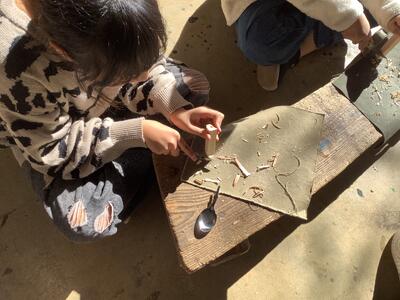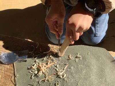 木材をナイフで削り形作るって、貴重な体験です。役に立ちそうな作業です。