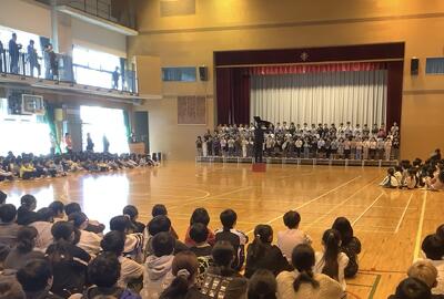 全校で歌った曲は「もみじ」です。追いかけっこになる部分が立体的に歌声が響いていました。