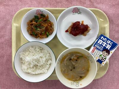 ごはん・牛乳・サムゲタン風スープ・ヤンニョムチキン・キムチチャプチェ
