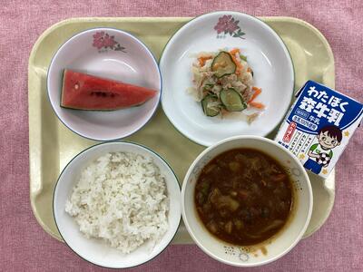 ごはん・牛乳・夏野菜のカレー・ツナサラダ・すいか