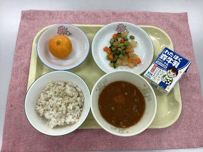 むぎごはん、ハヤシライス、カリポリ福神漬け、冷凍みかん