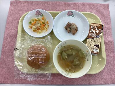 こどもパンスライス、ズッキーニのスープ、コールスローサラダ、鶏肉のハーブ焼き