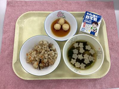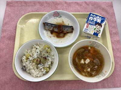 さつまいもご飯、豚汁、さんまのしょうが煮