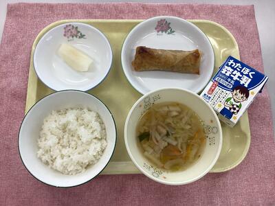 ご飯、中華スープ、手づくり春巻き、梨
