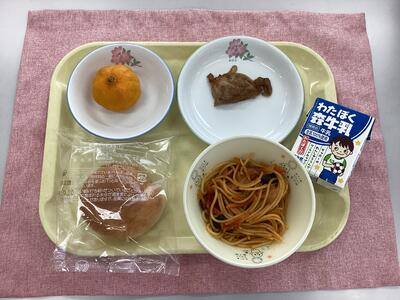 デニッシュペストリー、ナスとトマトのスパゲッティ、鶏肉のカレー焼き、冷凍みかん