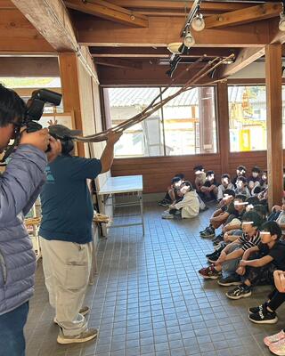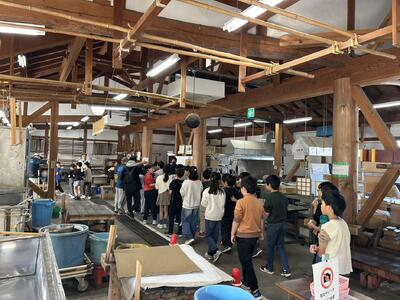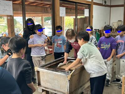 伝統工芸である和紙をつくる「紙すき」の体験をしています。