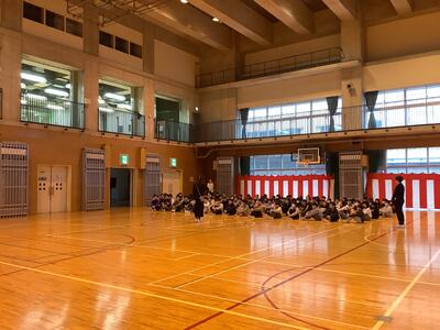 式の後、5年生だけ体育館に残り、学年集会をしました。