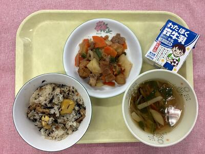 くり入りひじきごはん・牛乳・沢煮椀・仙台麩入り肉じゃが