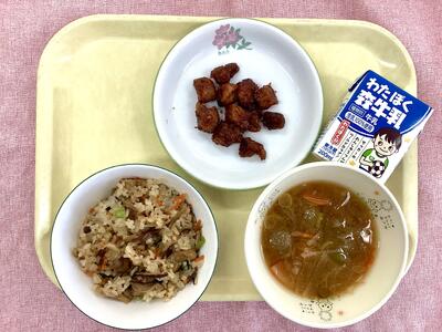 かてめし・牛乳・つみれ汁・豚肉のピリ辛揚げ