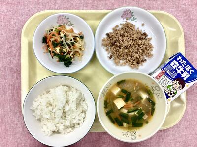 ごはん・牛乳・みそキムチスープ・ビビンバの具(そぼろ・ナムル)