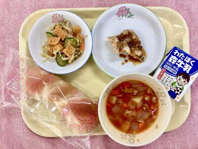 ツイストパン・牛乳・ミネストローネ・白身魚のハニーマスタードソース・ワンタンのパリパリサラダ